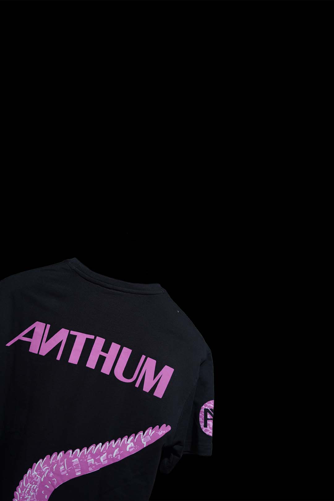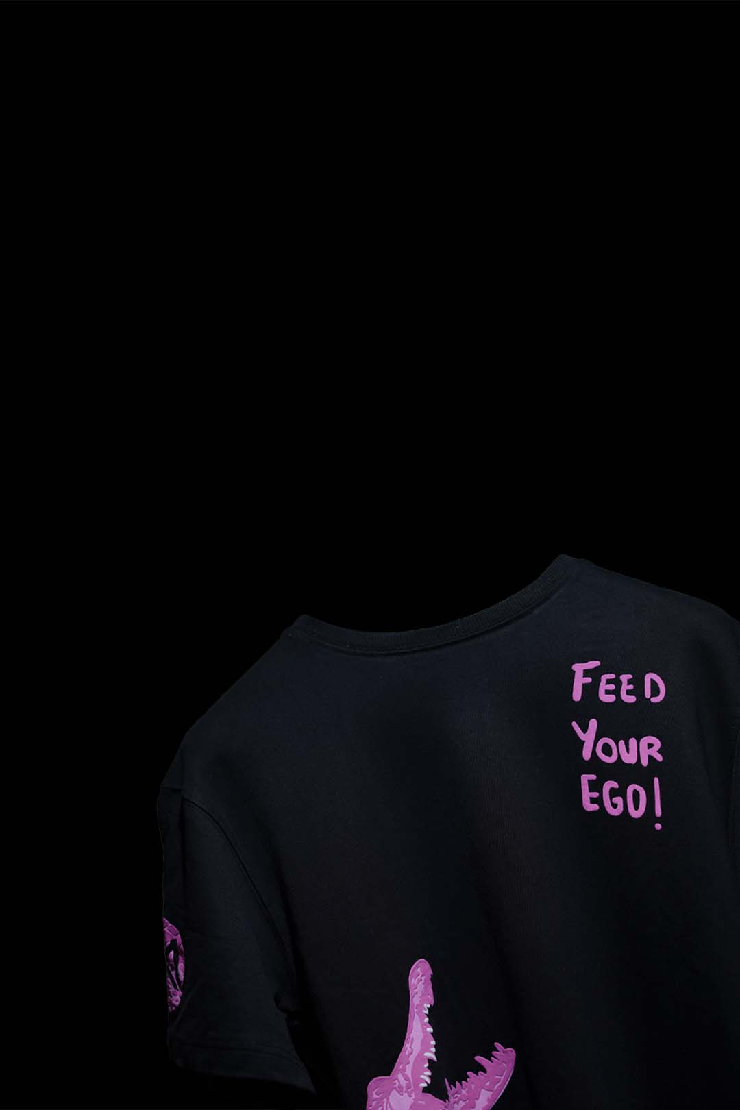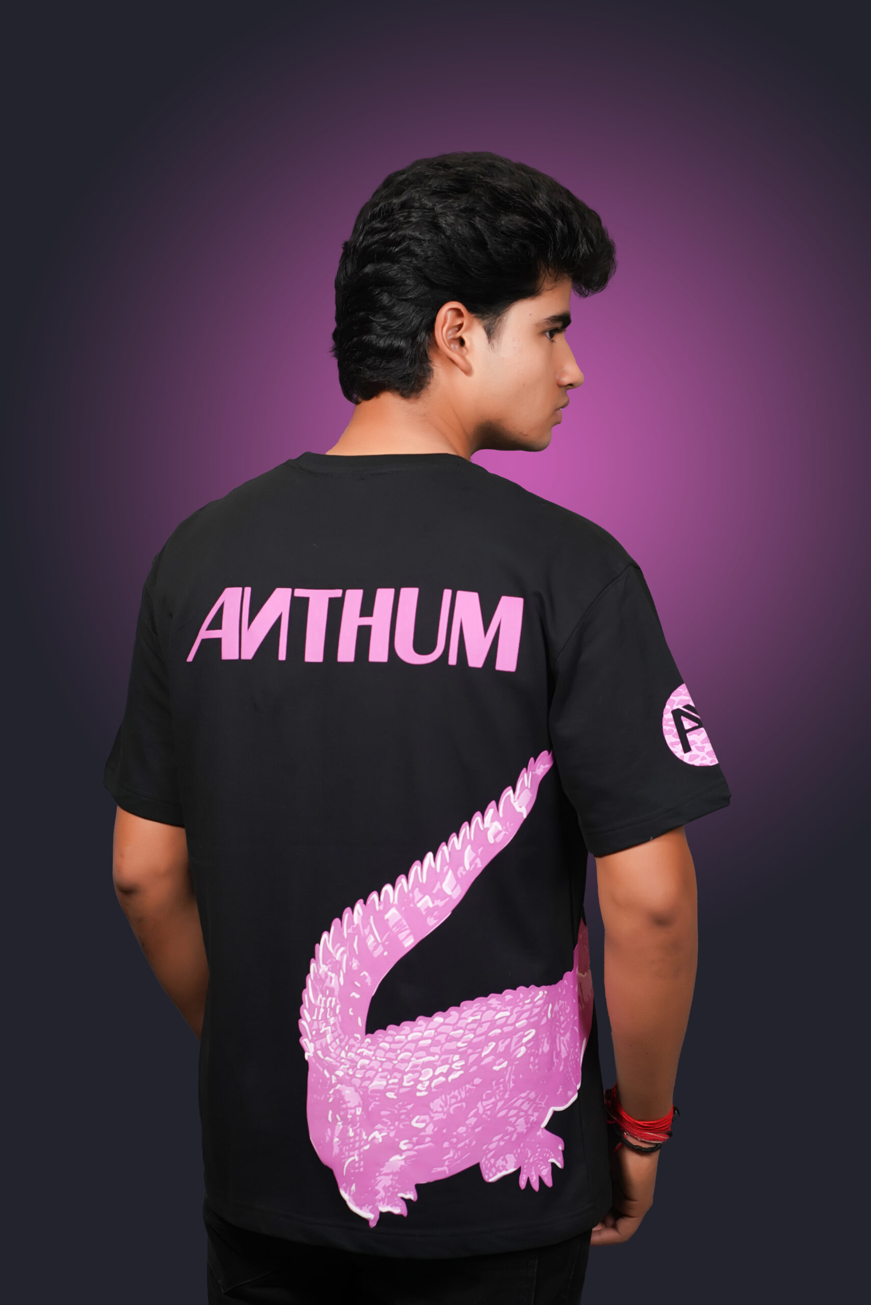 BLACK RELAXED FIT T-SHIRT WITH A CLASSIC CREWNECK AND ALLIGATOR IN SHADES OF PINK ON THE SIDE